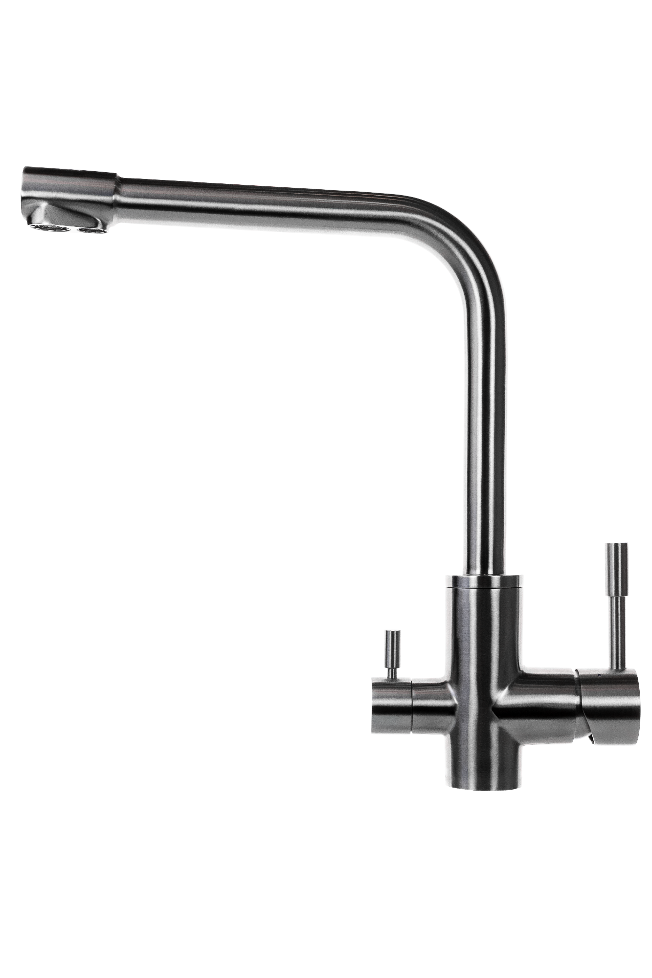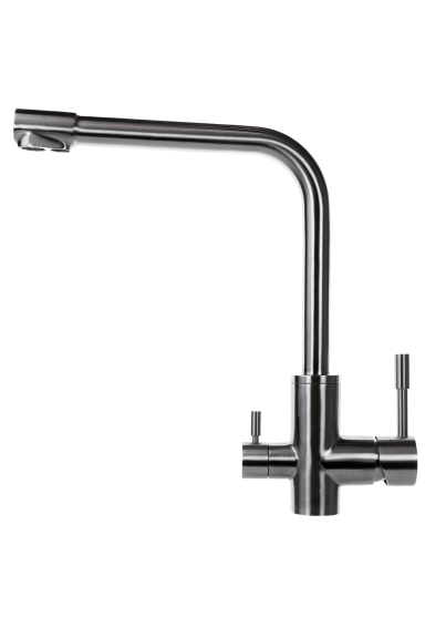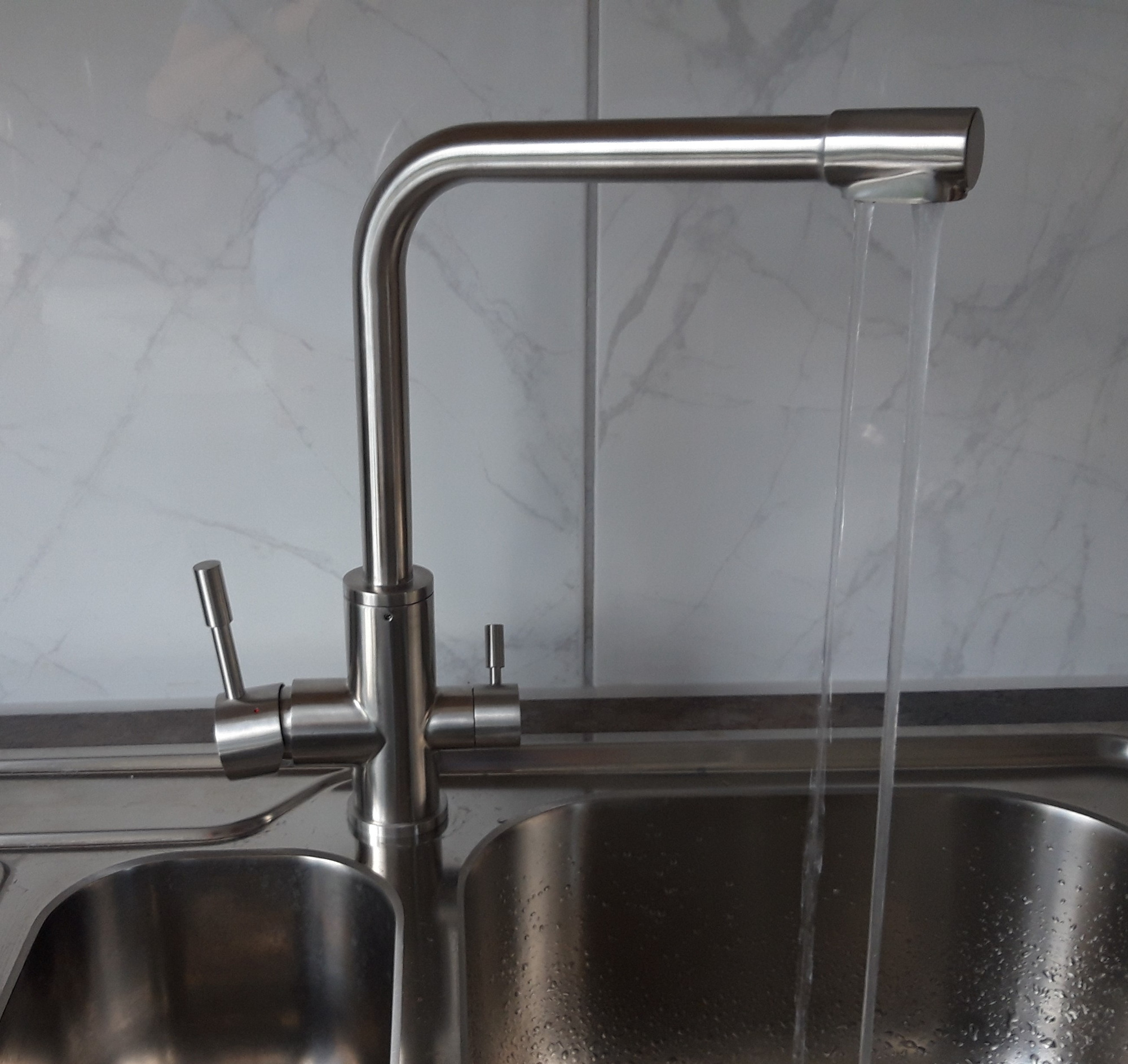 Dazu der elegante 3-Wege Edelstahlwasserhahn für Leitungswasser mit der Funktion warm und kalt, und die dritte Funktion für unser exklusives Trinkwasser.